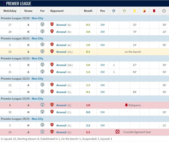 在罗德里效力曼城的六个赛季里,阿森纳只在23/24、24/25赛季两次在英超击败曼城,那两场比赛罗德里均未在场。