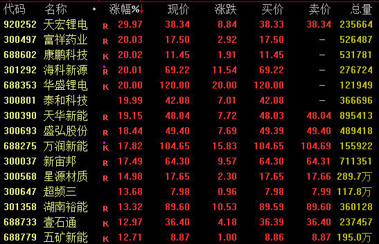 锂电、储能概念盘中集体飙升,截至收盘,天宏锂电30%涨停,华盛锂电、海科新源、泰和科技、海博思创等20%涨停,均创历史新高;天齐锂业逼近涨停;宁德时代盘中一度大涨逾9%,收盘涨7.56%,全日成交229.5亿元,位居A股成交额首位。