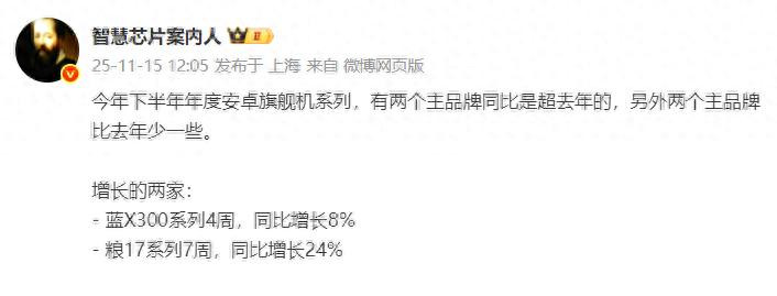 怕就怕在与友商的竞品比不过,同比自己上一代的机型销量还下滑。没想到这种情况还真出现了。11月15日行业人士“智慧芯片案内人”表示:今年下半年年度安卓旗舰系列,有两个主品牌同比是超去年的,另外两个主品牌比去年少一些。增长的两家分别是:vivo X300系列开售四周,同比增长8%;小米17系列开售七周,同比增长24%。剩下的两家大家都应该能猜到,在这里就不需要点出来了。且他特意指出是安卓阵营四个主品牌,相信大家都懂。