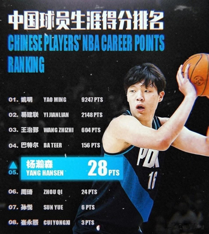 恭喜杨瀚森NBA职业生涯总得分来到28分,超越周琦升至中国球员得分榜第五位,congratulation,HANSENYANG!