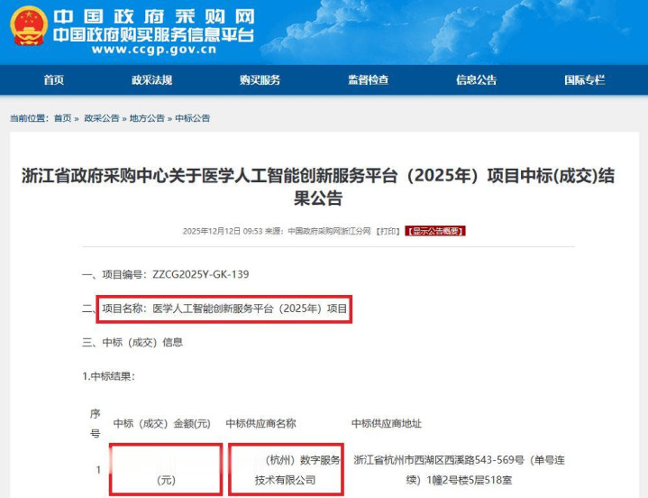 智东西12月12日报道,今天浙江省政府采购中心发布医学人工智能创新服务平台(2025年)项目中标结果公告,支付宝(杭州)数字服务技术有限公司中标,中标金额约为2.06亿元。