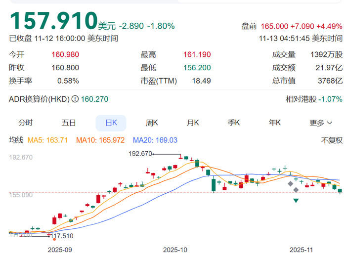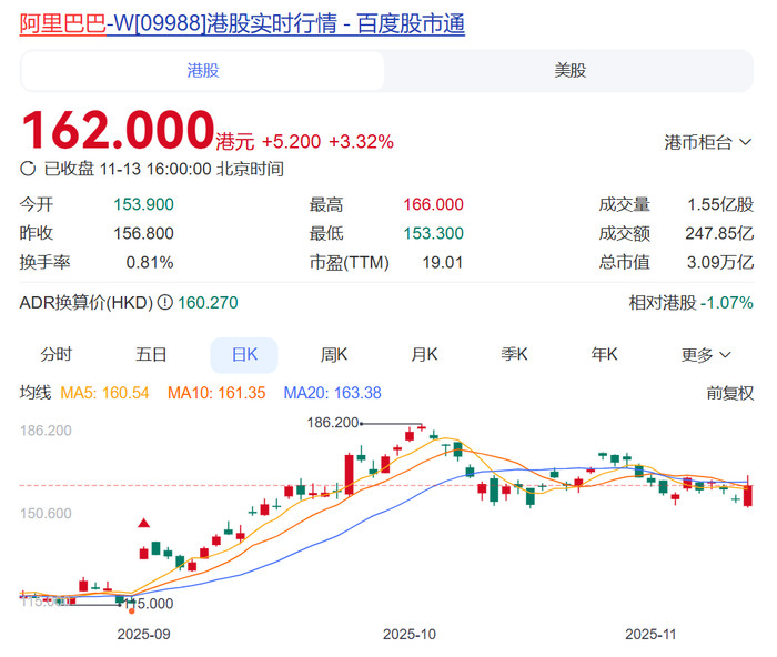11月13日,阿里巴巴股价大涨。截至发稿,其港股股价报收162港元,涨3.32%,年内涨超100%;美股盘前股价涨4.49%,报165美元,年内涨约90%。